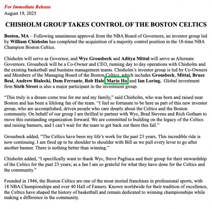 08月20日讯 凯尔特人官方宣布球队被奇泽姆领导的投资集团收购多数的股权。