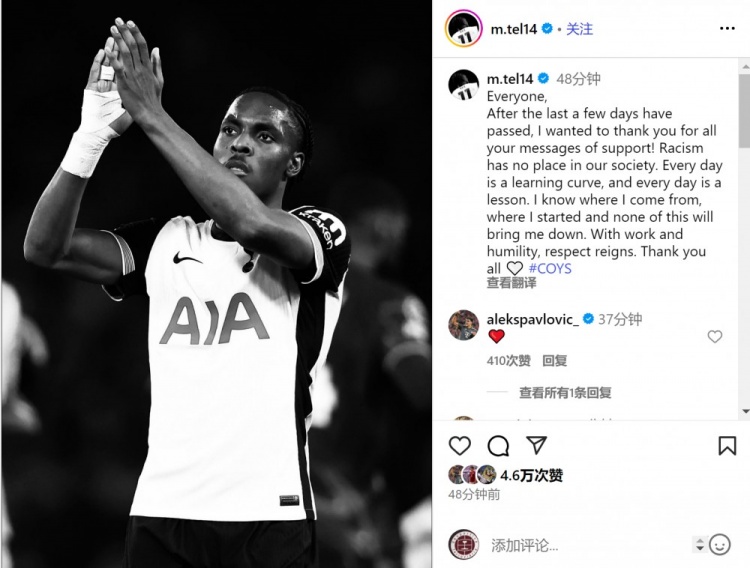 特尔在社交平台回应:“感谢近日所有支持我的讯息!种族主义不该存在于我们的世界。每日都是成长的机会,每次经历都是启示。我始终铭记自己的根源与起点,这些挫折不会阻挡我的步伐。凭借努力与谦逊,尊重终将战胜偏见。谢谢大家,热刺加油!”