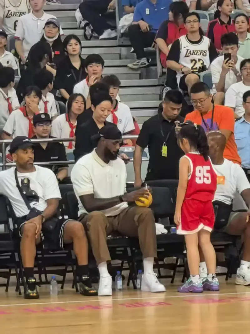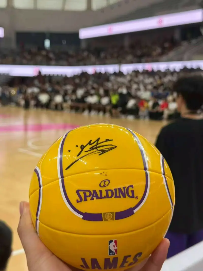 活动现场,詹姆斯为一名小粉丝带来的印有自己湖人球衣名字背号的篮球送上亲笔签名。