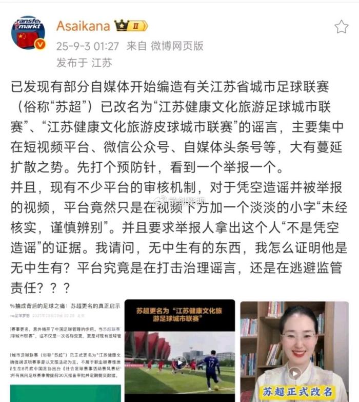 对此,德转朱艺表示,已发现有部分自媒体开始编造有关江苏省城市足球联赛(俗称“苏超”)已改名为“江苏健康文化旅游足球城市联赛”、“江苏健康文化旅游皮球城市联赛”的谣言,大有蔓延扩散之势。