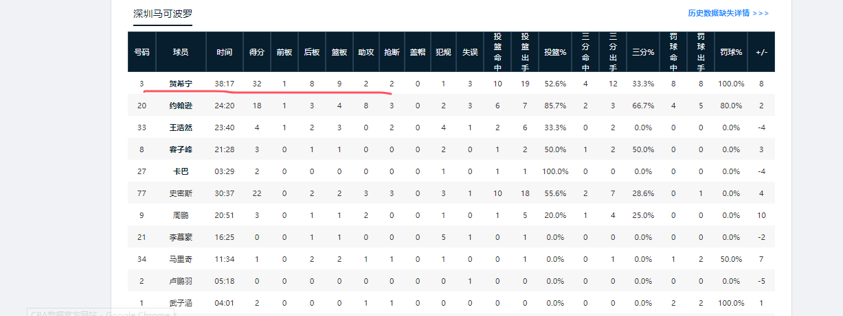 CBA常规赛第16轮,深圳男篮客场87-83击败辽宁男篮。本场比赛,深圳前锋贺希宁表现抢眼,全场投篮19中10,罚篮8中8,独砍32分9篮板2助攻2抢断。其中他的得分数为全场最高,篮板数均为全队最高。