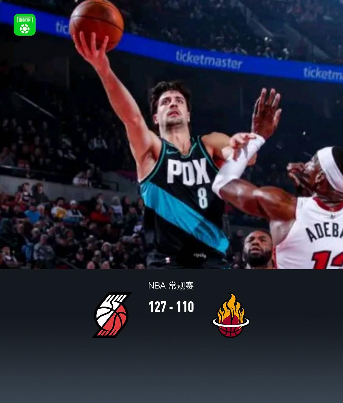 第四节开拓者谢登-夏普拿下12分,热火迈伦-加德纳拿下6分,最终开拓者127-110战胜热火